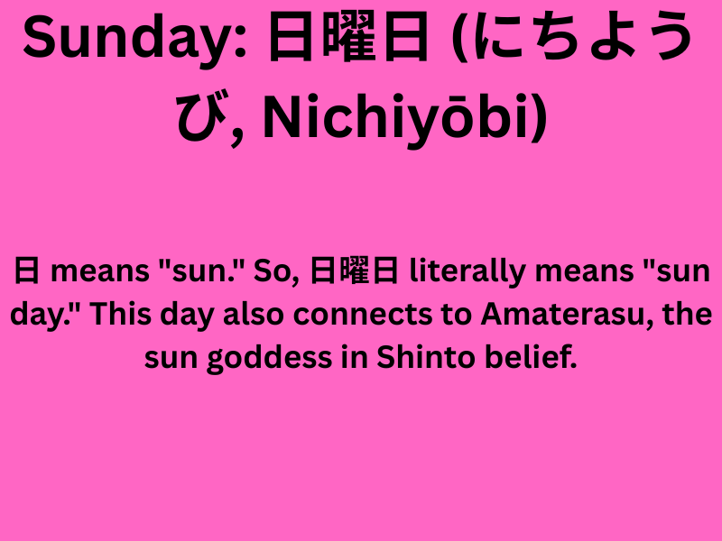日 means “sun.” So, 日曜日 literally means “sun day.” This day also connects to Amaterasu, the sun goddess in Shinto belief.